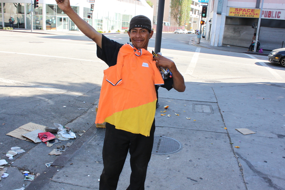 I was so excited by another couple who graciously let me into their home as they were cleaning up and sweeping just as we all do in our homes. Only their home was downtown Los Angeles’ 6th street in Skid Row. The husband did not speak english but the wife did, and she explained that I come in peace and with offerings of love. He held up the polo with such curiosity! It was truly heart warming.